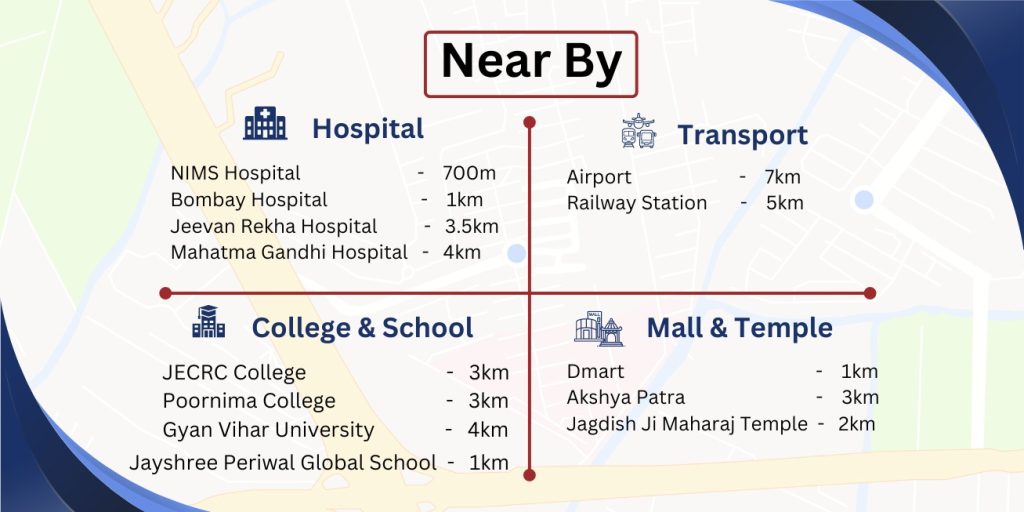 With the rapid growth in this area, Jagapura connects Jaipur to India’s most significant metropolitan cities, Delhi and Mumbai.The government sets aside 3000 acres of land to establish non-polluting industries and create a special economic zone. Due to its superb infrastructural development, it is a top choice for residential property for the people of Jaipur and NCR.. Rate of property here ranges around ₹4500 per square foot.